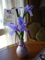 | 【吉田麻利子 大宮西教室】 ラスベガスで開催されたAIFDのシンポジウムに行ってきました! 6月28日から7月2日にかけて、ラスベガスで、AIFDのシンポジウムが開催されていました。期間中はさまざまなイヴェントが目白押しで、コンテストあり、見本市あり、デモンストレーションやパーティなど、盛りだくさんの内容でお花にどっぷり浸ることができました。デモンストレーションでは、世界各国のフラワーデザイナーが作品を披露してくれましたが、場内が暗くて作品の写真が撮影できず、残念! イヴェント会場でいただいたウェルカムフラワー?もシンプルながら、とてもキュート! フラットワイヤーの使い方がとても素敵でした。花材の違うデザインの中から、アイリスをいただいてきました。