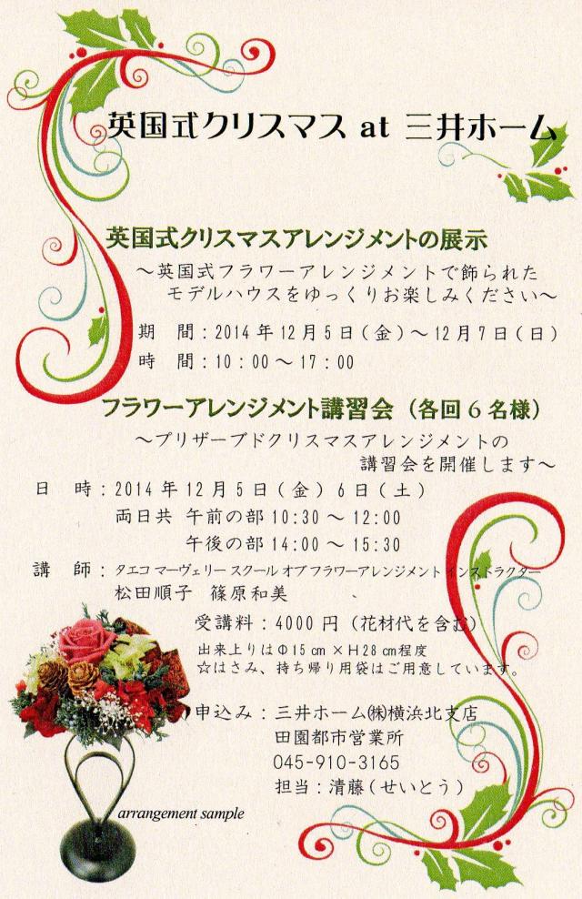 | 神奈川に教室を持つインストラクターたちを中心に 開催する展示会をご案内します 「英国式クリスマス at 三井ホーム」 2014年12月5日(金)~7日(日) 10:00~17:00 会場:三井ホームたまプラーザモデルハウス 横浜市青葉区新石川3-15 TVKハウジングたまプラーザ第一会場内 ♪英国式クリスマスアレンジメントの展示会 ♪フラワーアレンジメント講習会 (プリザーブドフラワー) 12月5日(金)6日(土)両日 AM10:30~12:00 PM14:00~15:30 詳細・お申し込みは 三井ホーム㈱横浜北支店 045-910-3165 タエコマーヴェリースクールオブフラワーアレンジメント神奈川支部担当 篠原和美 |