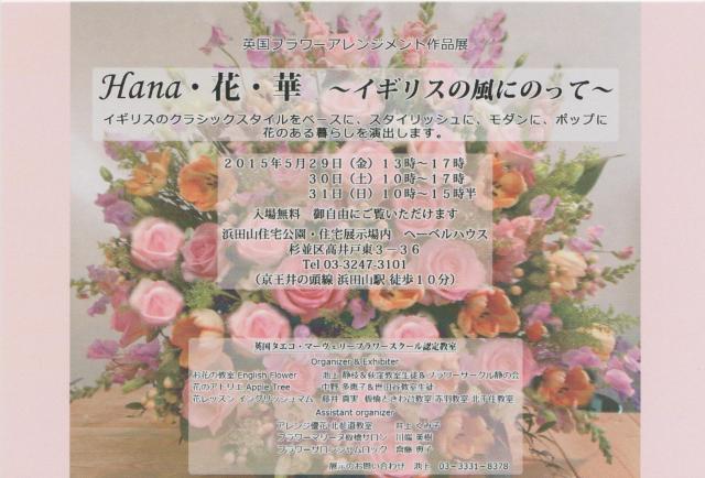 | 荻窪、赤羽、世田谷教室合同の インストラクターと生徒さんによる 作品展を開催します。 英国フラワーアレンジメント作品展 Hana・花・華 ~イギリスの風にのって~ 2015年5月29日(金)~31日(日) 10時~17時 (初日は13時~) 最終日 ~15時半まで 会 場:浜田山住宅公園・住宅展示場内 へーベルハウス 杉並区高井戸東3-36 (京王井の頭線 浜田山駅徒歩10分) 荻窪教室 池上 静枝 世田谷教室 中野 多恵子 赤羽教室 藤井 真実 井上くみ子 川端 美樹 斉藤 典子 |